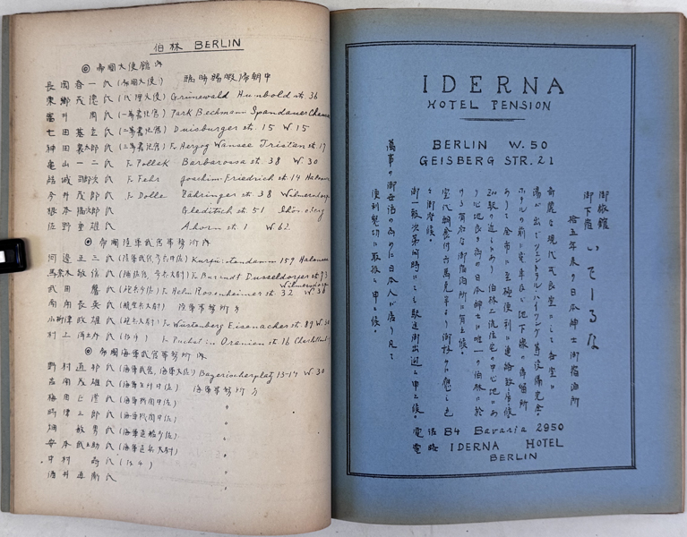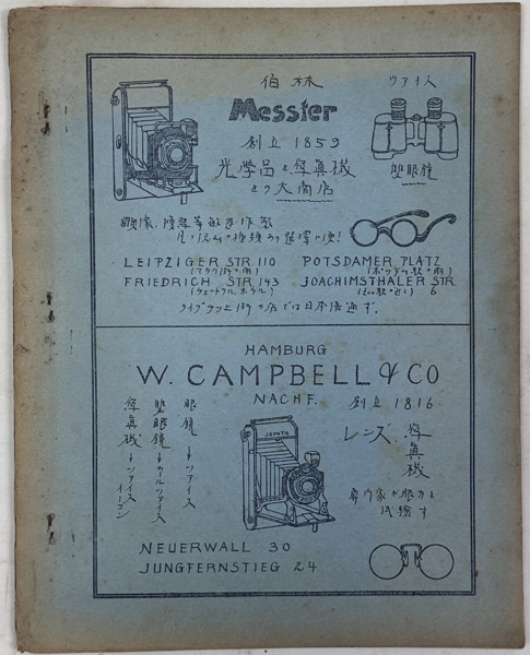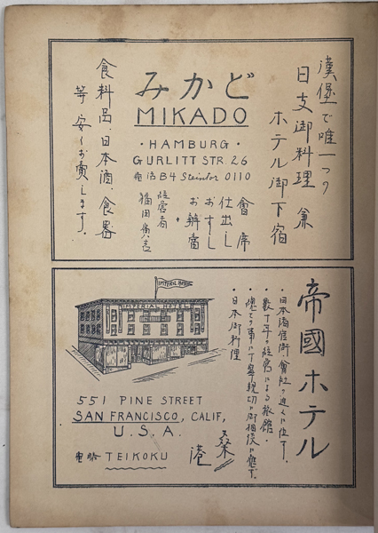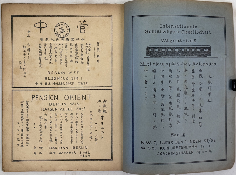 ドイツの首都ベルリンで発行されていた在独邦人向けの月刊誌 この雑誌は、当時のドイツの政治・社会情勢を現地在住の日本人の視点で詳細に分析しており、 日本国内では発禁処分となるような内容も扱っていた。 誌面には、当時のドイツの深刻な社会情勢や国際的な動向に関する記事が多数掲載。 当時の在ベルリン日本大使館関係者や著名な在留邦人のリストも掲載されています。 広告ページからは、当時のベルリンにおける日本人コミュニティの生活インフラが確認できます。